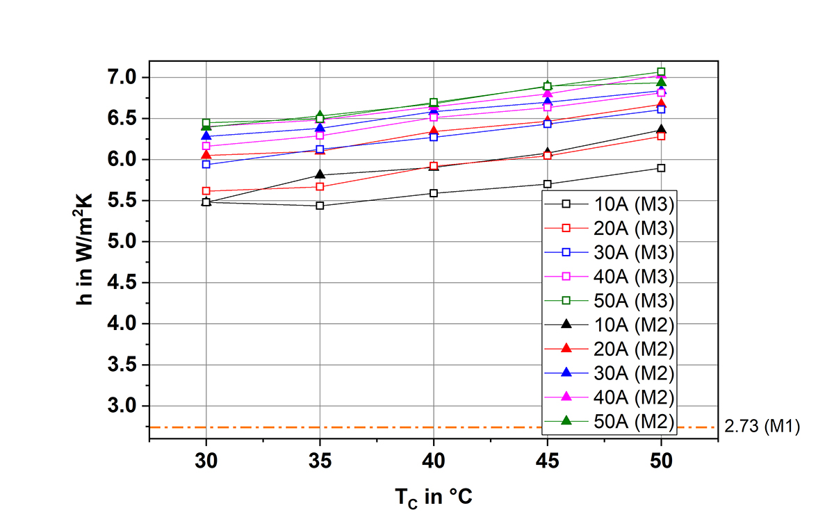 In Fig. 3, it can be clearly seen that the HTC is determined by the classical dummy method (M1) differs a lot from the one determined by a HFS (M3). In the dummy method, the heaters in the calorimeter chamber heat up a dummy, made from an Al alloy with similar mass and dimensions as the cell, stepwise. The HTC is determined from the slope of the curve of the temperature difference between the dummy and its surroundings vs. the time. Obviously, this situation differs from a Lithium-ion cell where the heat is generated from inside. However, there is a very good agreement between the HFS values (M3) and the values from M2, which are derived from an exponential fitting to the cooling curve after switching off the current. In addition, the HFS method allows measuring the HTC simultaneously as a function of temperature and applied charge/discharge current.