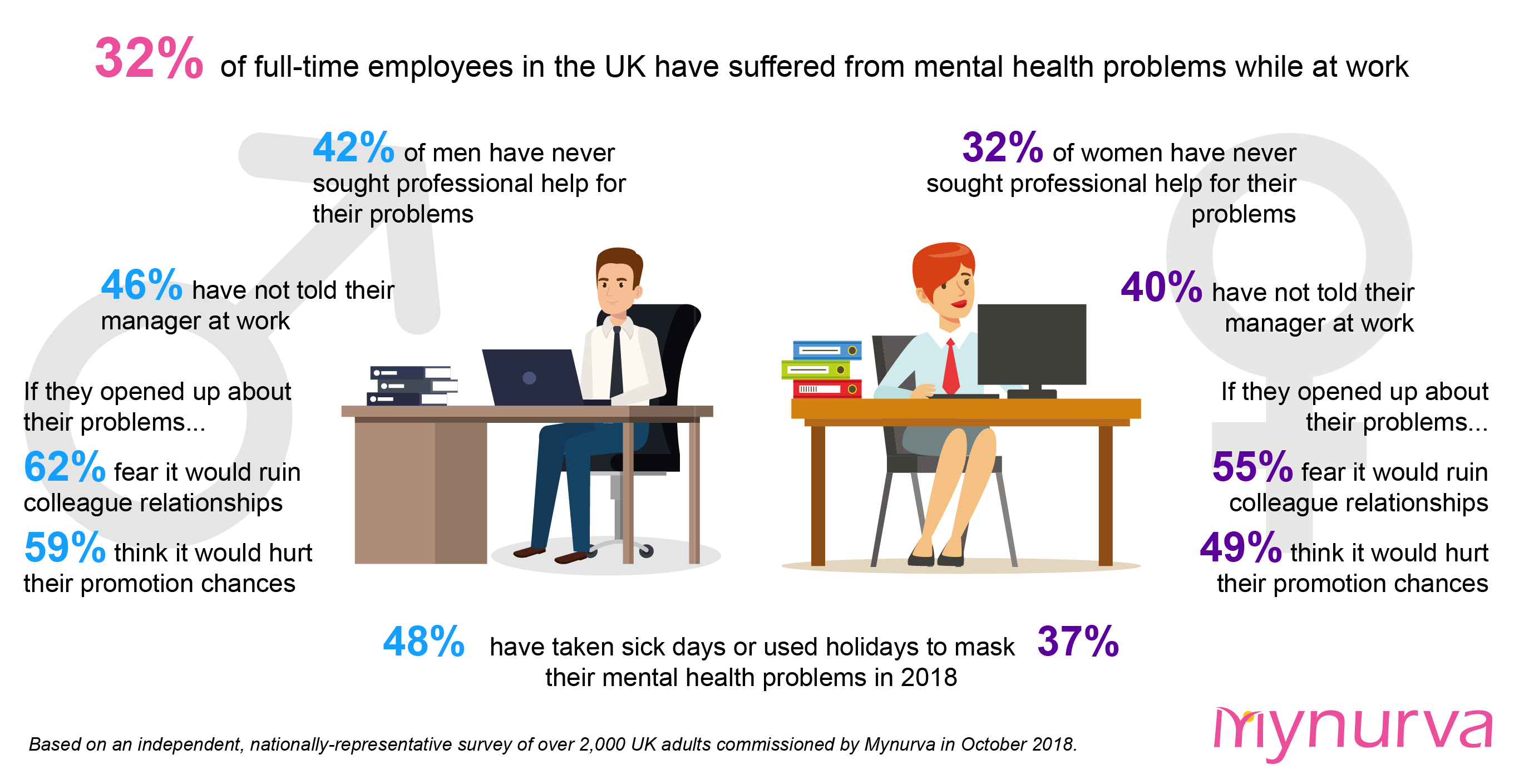 Mynurva recently conducted a nationally representative survey among more than 2,000 UK adults in an attempt to uncover how many working professionals have suffered from mental health symptoms. What’s more, the study also delved into the challenges inhibiting full-time workers from seeking the help they need.