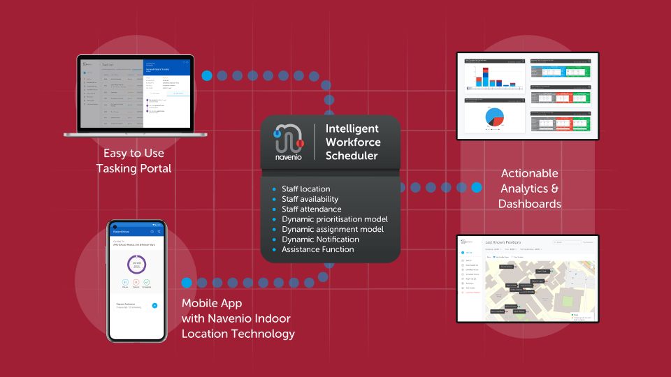 The Navenio app works by allowing any authorised member of staff to add tasks to the web-based Tasking Portal. These tasks are then automatically scheduled and allocated to the most appropriate person using the location-powered scheduling system of the right person, right time, right place. This automation optimises resources and workflow, whilst Navenio’s analytics allow managers to gain deep insight into what has happened and where workflow can be improved.