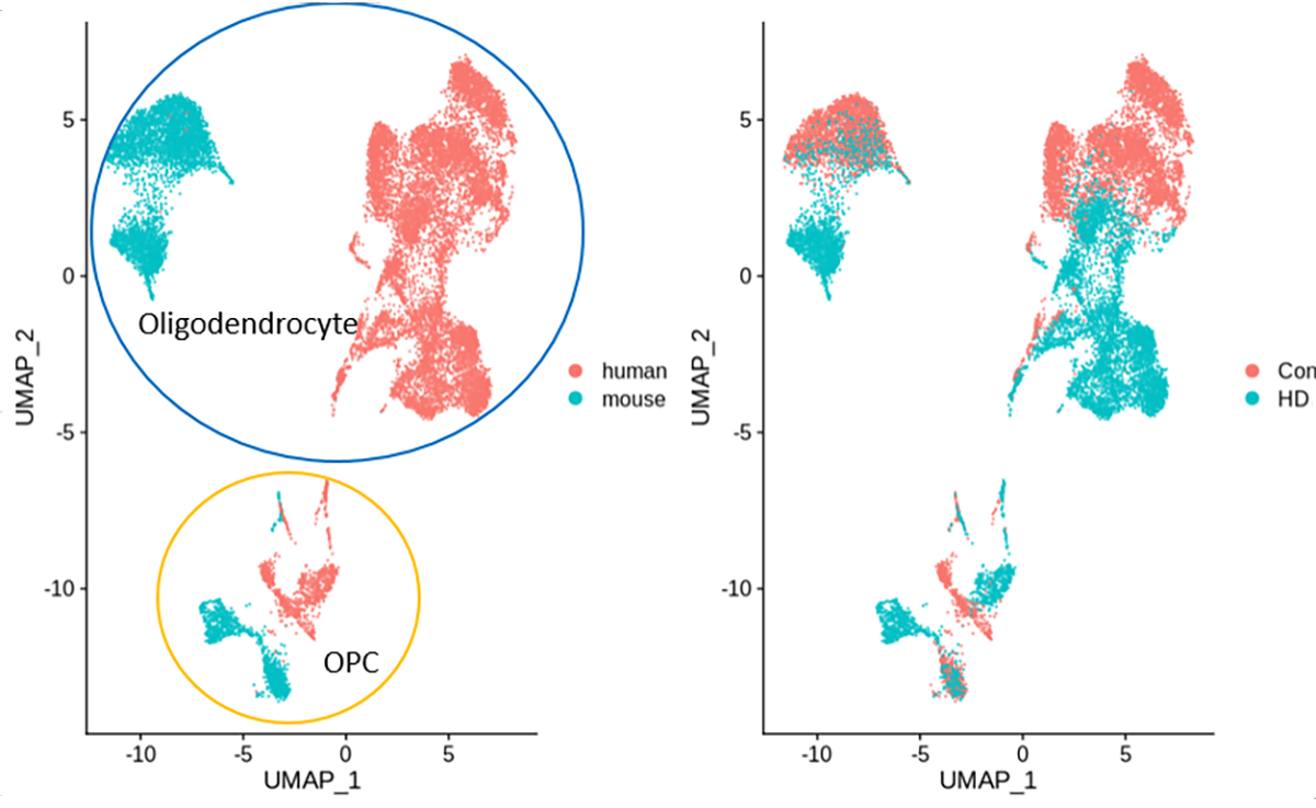 By using snRNAseq from our human HD brains and Dr Thompson’s HD mouse brains, we have been able to directly compare the changes in gene expression in all of the different central nervous system cell types. We have found many similarities in both neurons and glial cells between human and mouse HD, although there are some differences as well. As one example, we have found similar changes in oligodendrocytes, the cells that make myelin, the fatty insulating substance that wraps around the axonal processes of neurons, allowing for rapid conduction of information through the brain. Interestingly, both radiology and autopsy studies of patients with HD have discovered abnormally low myelination in the HD brain, and studies of mouse models have found similar pathology. Thus, our studies of single-cell gene expression in human brains and this mouse model helps to illuminate the basic molecular causes that underlie the myelination defects.