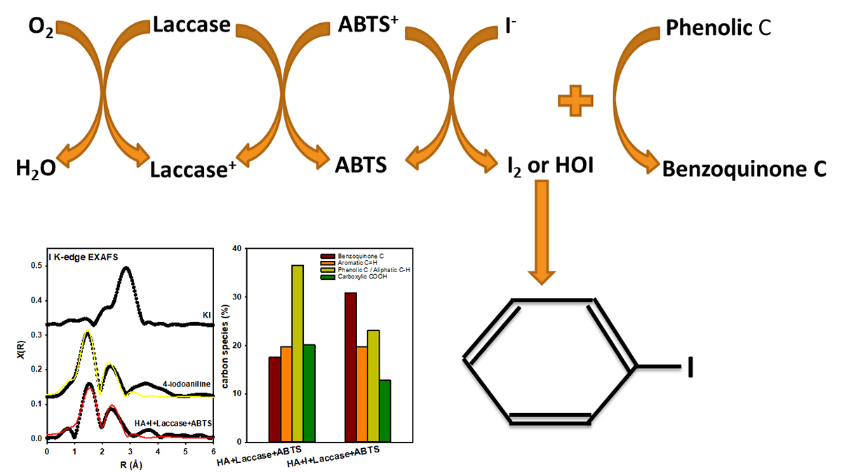Thus, a better understanding of the molecular binding of the I to the organic core is required to solve this problem. A recent study by Li et al (2019b) aimed to improve our molecular-level understanding of NOM-iodine interactions and enzymatically-mediated iodination reactions in aqueous media. These authors investigated the mechanisms iodine and carbon species are bound to three different humic acid (HA)-I systems using I K-edge XANES and EXAFS and C K-edge XANES spectroscopy: 1) I- in the presence of the laccase enzyme and a mediator (2,2′-azino-bis(3-ethylbenzothiazoline-6-sulfonic acid, ABTS) at pH 4 buffer, 2) I- in the presence of lactoperoxidase and H2O2 in pH 7 buffer, 3) IO3- at pH 3 groundwater.