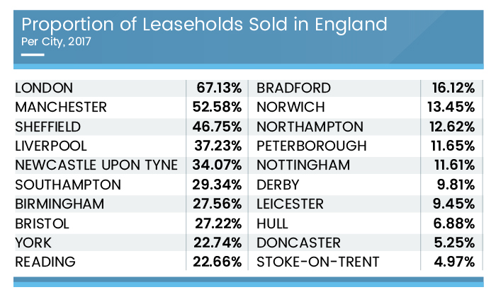Sellhousefast.uk looked at the share of leaseholds sold in the largest English cities in 2017 and found major differences. The leasehold system was found to be most widespread in London and Manchester where leaseholds accounted for 67.13% and 52.58% of all properties sold, respectively. Sheffield had the third largest share of leasehold properties – 46.75%, followed by Liverpool (37.23%) and Newcastle upon Tyne (34.07%).