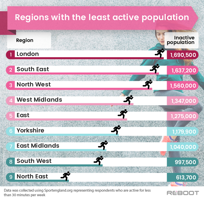 Contrastingly, the English area with the least number of inactive people in the North East, with 613,700 – meaning there are 1,076,800 more inactive people in London than the North East.