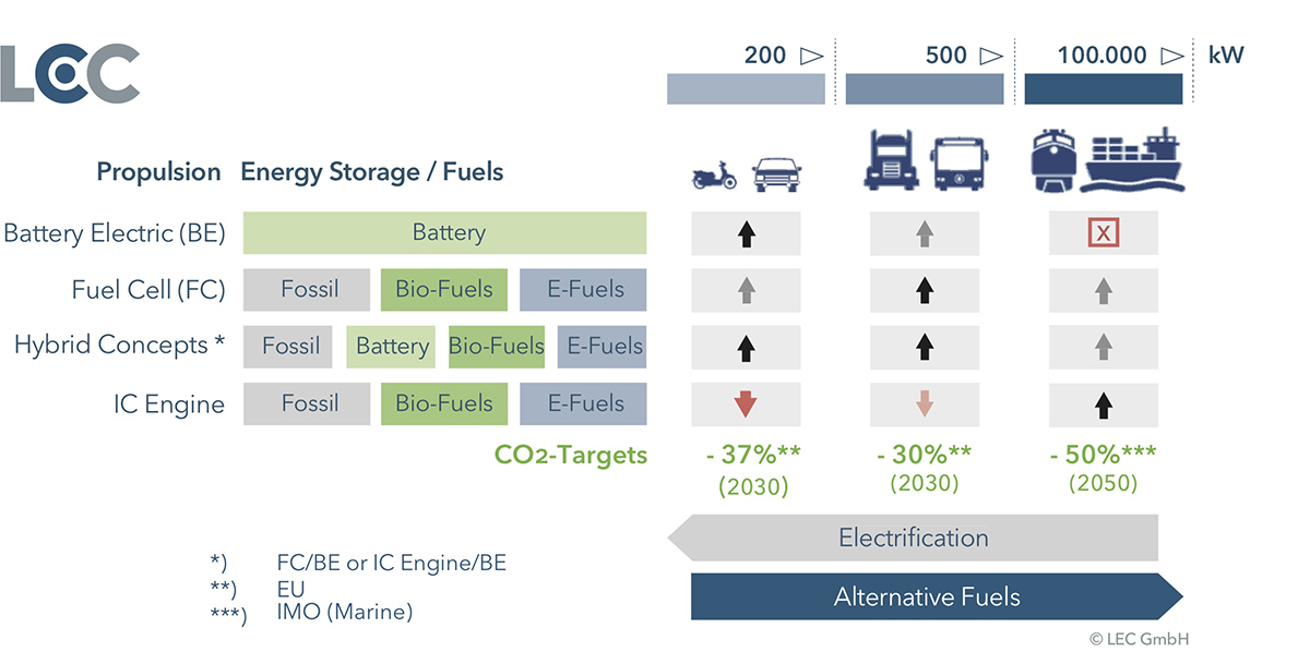 Alternative fuels will also be decisive for the mobility and transportation sector to achieve the CO2 targets of the various segments to be implemented in a short time, compare Figure 2 Trends in propulsion for mobility and transport. Pure battery-electric powertrains will generally be suitable for smaller applications, such as scooters and small cars while alternative fuels must be used in larger applications.