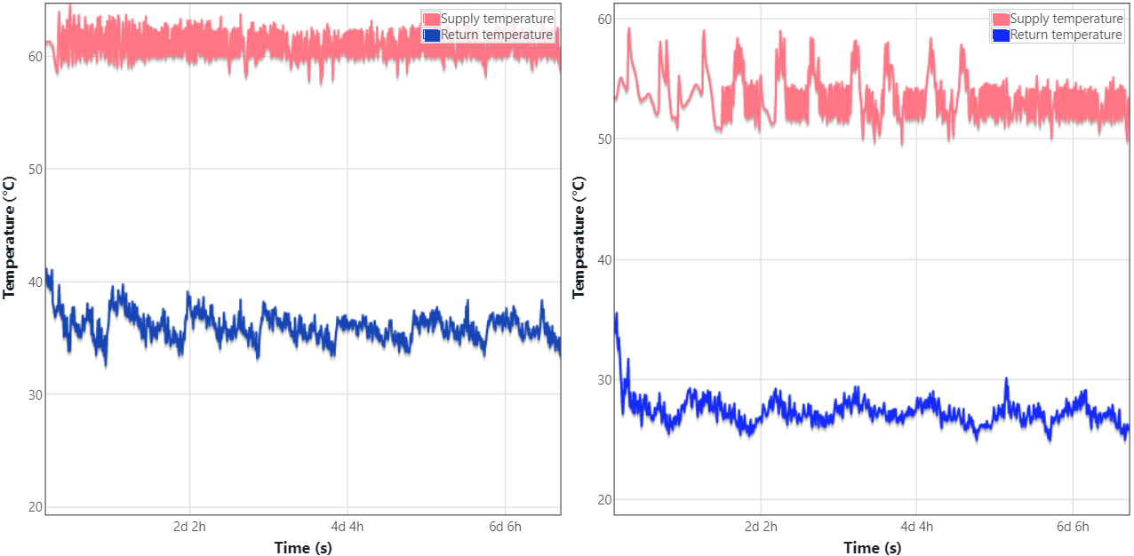 As the plots in Figure 1 indicate, the optimised design will deliver lower operating temperatures. In combination with smaller pipes and an improved keep warm strategy, distribution losses have dropped with 59%. Pump consumption has decreased with 53% and COP of the heat pump has increased from 3 to 3.4. Overall, this has led to an energy cost saving of 29% and a carbon saving of 39%. Over a 25-year lifetime, life cycle cost saving of 3.200 €/apartment has been realised.