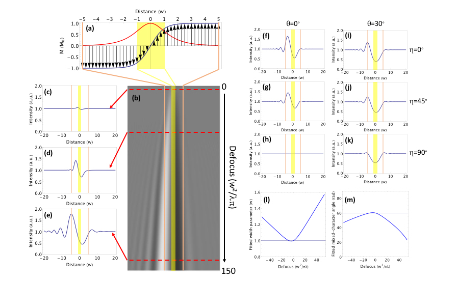 The key finding in this article is a recipe for data analysis that takes as input a set of heavily blurred defocus images of a hybrid Bloch/Néel domain wall, where the wall appears enlarged and η may appear under- or over-estimated and produces as output the “true” values of the domain wall width and the mixed-character angle. This new algorithm relies on image simulations carried out with the full Fresnel propagator in a wave-optical framework that includes interference and diffraction effects. As a result, we are no longer forced to choose between images that are either blurry and contrasted (large defocus) or sharp but noisy (small defocus). We have learned how to refocus spin structures with LTEM.