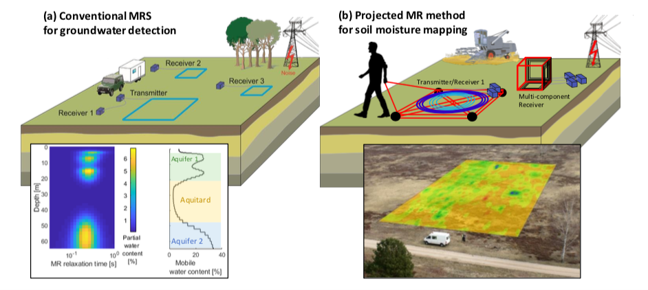 Especially regarding the challenges coming along with the climate change, novel techniques are required to rapidly observe soil water dynamics in critical regions and, in doing so, to support environmental and agricultural sciences. Soils and the corresponding chemical and mineralogical cycles react sensitively on weather extremes such as long-lasting dryness and heavy rainfall events. Thus, our recent research is focused on developing a method for moisture mapping based on the MRS principle. To overcome the noise problem mentioned above, we pursue two principle strategies. First, we continuously improve our noise cancellation approaches. We could recently demonstrate that, by using a novel multi-component reference antenna (Fig.1b), the noise in problematic urban areas can be suppressed to a level that allows the detection of mobile water in a tiny multi-turn MRS coil with an area of less than one square meter (Costabel, 2019).