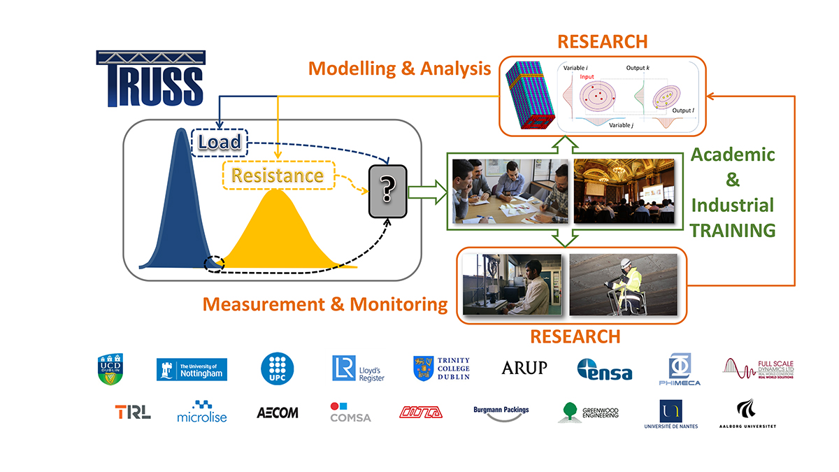 In a high-level assessment, these variables will be defined by a range of values with a probability of occurrence. Multiple combinations of these input values lead to output responses that become more scatter as the input variables are less well-known, and as the modelling errors increase. Training in Reducing Uncertainty in Structural Safety (TRUSS), is a €3.7 million Marie Skłodowska-Curie Innovative Training Network (ITN) composed by six Universities, 11 companies and 1 research institute from five European countries, joining forces to identify, quantify and reduce uncertainties associated with the probability of structural failure. For this purpose, 14 fellows are recruited to be trained with the right combination of transferable and research-related skills, and to conduct research in specific projects while being exposed to academia and industry, different culture environments, disciplines, and sectors, that will prepare them for dealing with the challenges of an ageing infrastructure stock.