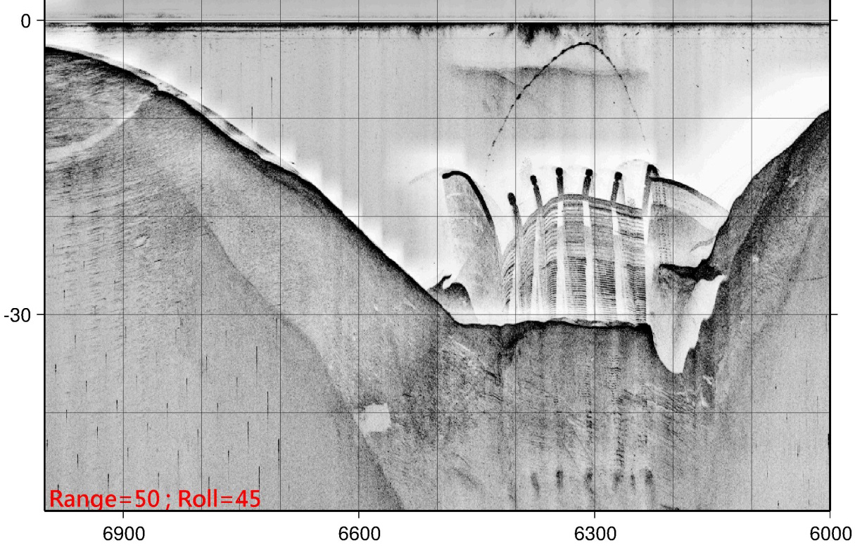 Operators, therefore, are towing side-scan sonar transducers at the optimum height above the bottom of the seafloor to produce better quality side scan sonographs. However, this can be done only if the bottom is moderately flat. Sonographs with maximum tonal intensity are easily produced on a steep slope, like valley banks, and any vertical situated structure. The strong signatures are then recorded over all ranges due to the poor geometry of sonographs produced without acoustic shadows. To create clear scanned images of a steep slope using side-scan sonar, rotating the towed fish or tilting the transducer face to the dipping slope surface is done. Cases conducted on the shore of the Wushieh Reservoir and Sun Moon Lake, in which the bank slopes can be varied from 10° to 60° are displayed. In general, the angle of the scanned slope determines the degree of the towed fish rotation angle. The rotation angle is set at a smaller angle than the slope, giving stronger returns from the lower slope. In contrast, the rotation angle set at a larger angle produces a null return outside the insonified area in the lower slope. To the offshore wind farm, a turbine foundation can be observed in the side-scan sonographs using this strategy. This demonstration also gives results that affirm the value of side-scan sonar as a powerful tool in underwater inspection.