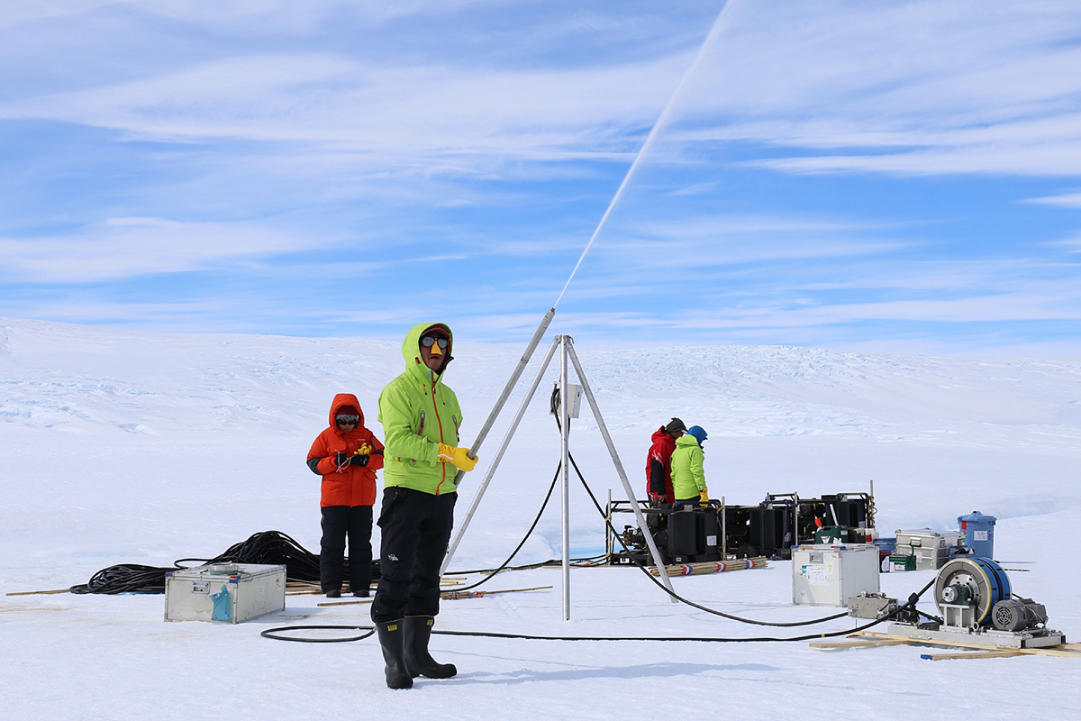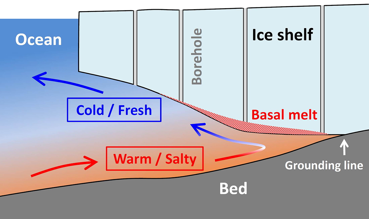Answers to key questions are hidden under the ice. Basal melting occurs at the base of the ice shelves and heat is supplied by subshelf ocean circulations. Hot-water drilling is a tool to enable direct access and in situ measurements at the subglacial environment. In 2012 and 2018, we used a hot-water system to drill through the 250–400 m thick ice shelf of Langhovde Glacier (Fig. 2). Measurements under the ice revealed temperature and salinity distributions over the entire range of the cavity. Data indicates relatively warm ocean water enters into the deeper region of the cavity, supplies heat for basal melting, and upwells with meltwater along the base of the ice (Fig. 3). Basal melting occurs in the entire region of the ice shelf at rates of several metres per year.