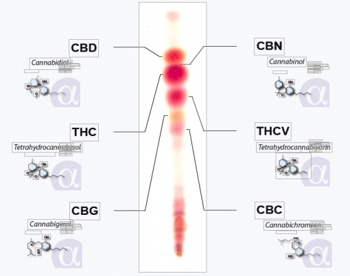 Cannabinoid Fingerprint of AlphaCAT TLC results showing the 6 main cannabinoids detected