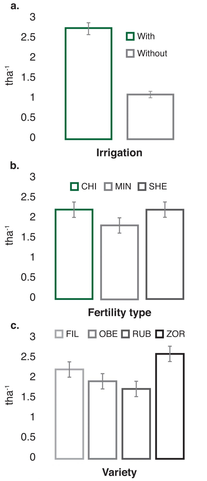 Irrigation: The use of supplementary irrigation was found to significantly increase grain yield (Fig.1a) only in the seasons with low winter rainfall, (2015-2016/2016-2017), while it had no effect on grain yields in the season 2014-2015 with relatively high winter rainfall (data not presented). In Figure 2 average monthly rainfall and temperatures are presented for all three seasons. Since supplementary irrigation substantially increased lodging levels (which is known to negatively affect grain quality) in the season with high rainfall, it is recommended that supplementary irrigation is only used when long-term forecasts and rainfall and/or soil moisture monitoring indicate that crops do or are likely to suffer from an insufficient water supply.