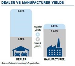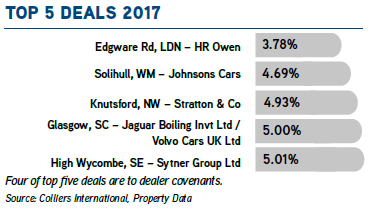 Mark Charlton, adds: “While you might expect the manufacturer covenant to generate a lower yield, 4 out of 5 of the top deals are for sites with strong dealership covenants, with the keenest yield (3.78%) being for a prime London location. Having said that, the yield spread for dealer transactions is much wider than for manufacturers, reflecting the potential differential in financial strength.”