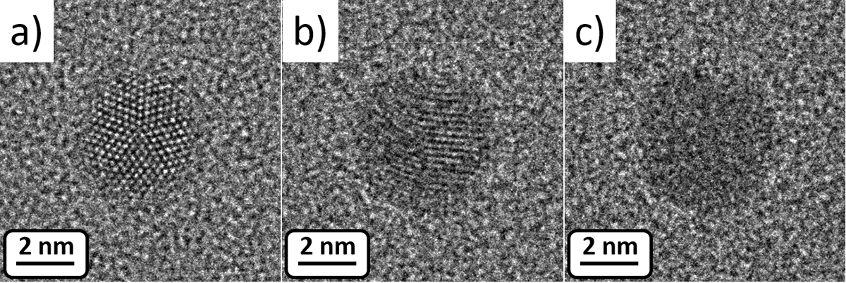 However, for applications where surface properties are important, for example, catalysis, the exact melting process is of higher importance than the state of the interior of the particle. This is the type of information that can be derived from high-resolution transmission electron micrographs. Figure 2 shows three frames from an image sequence acquire at 612°C. In frame a), the crystalline lattice is clearly resolved with the five-fold symmetry, which is typically observed for gold nanoparticles. The crystalline particle is surrounded by a halo, which we interpret as mobile atoms (i.e. molten). Frame b) still shows fringes but not as clear. In frame c) which is acquired 0.2 seconds after frame b), no fringes are observed and the particle is molten.