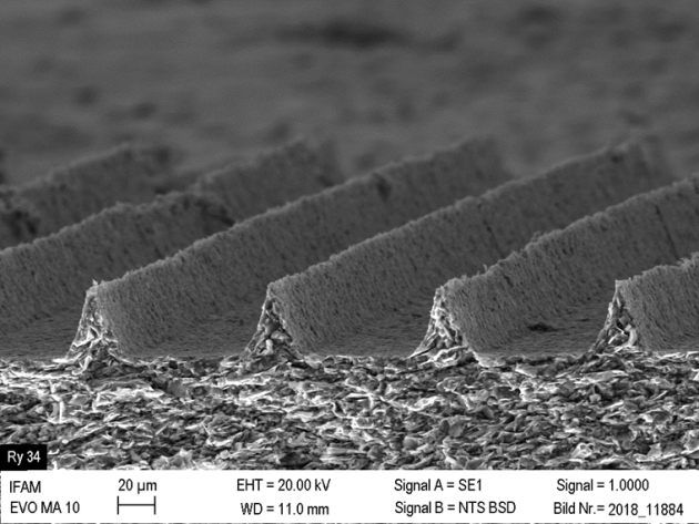 To enable the usage of such micro- and nanostructures, special development on the surface material for better durability in rough conditions has been done. Implementation of nanoparticles such as silica to obtain nanofunctionalized surfaces for better resistance in rough conditions has been carried out. Microstructured heat-resistant surfaces have been developed and are available for tests at project partners’ premises (Figure 3). For the formulation of the coating silanol-functional and silazane- functional resins have been selected to achieve high-performance coatings with good flexibility and heat resistance. For improvement of heat resistance special pigments have been examined and evaluated to gain outstanding resistance to temperatures up to 1000°C. The incorporation of the selected particles and the dispersion partly to nano-scale have been developed and assessed.
