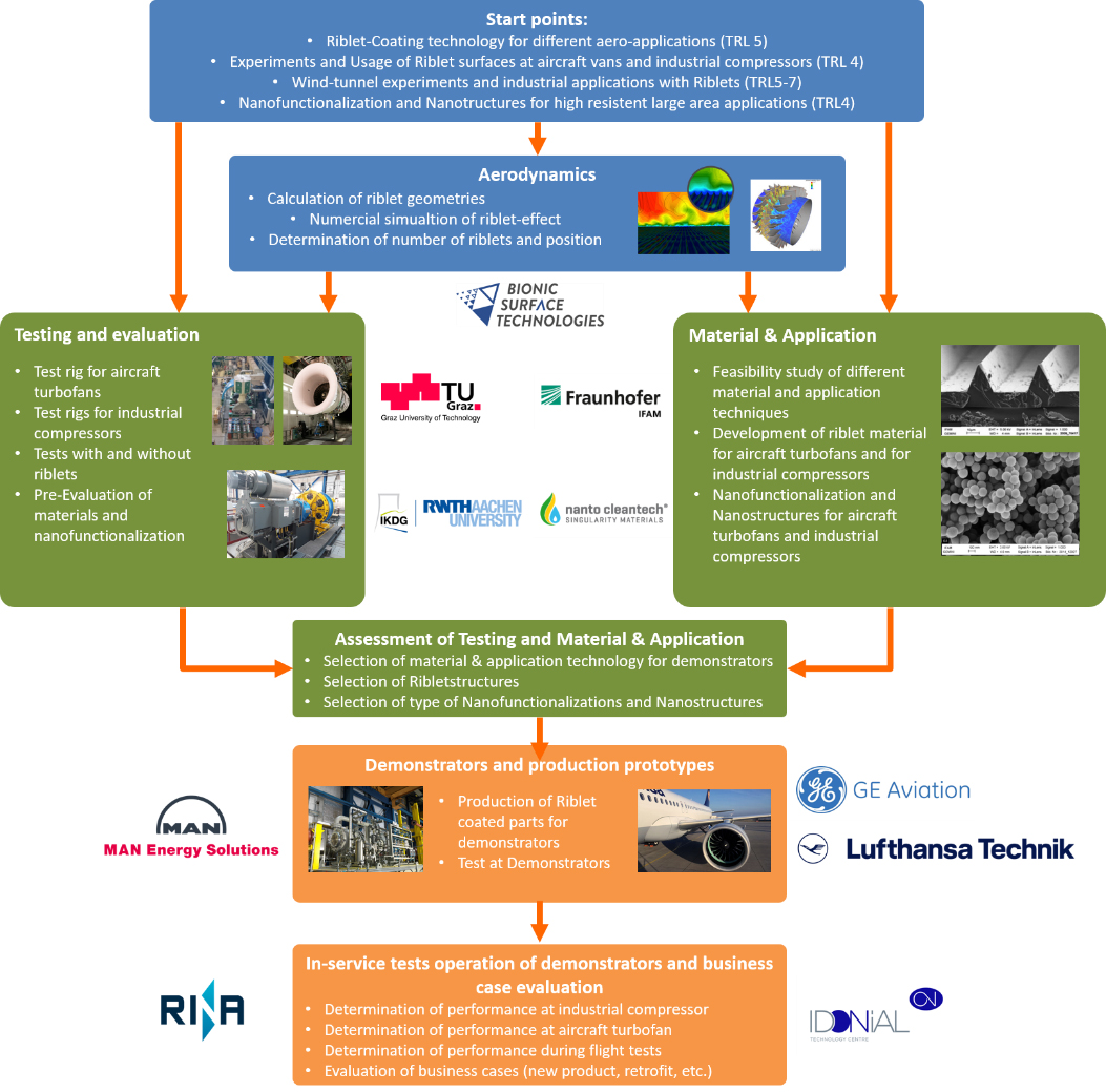 During the project, riblet’s design is determined based on the calculation of geometries, numerical simulation of the riblet-effect and the selection of number of riblets and their position. Secondly, several tests are performed for aircraft turbofans and industrial compressors. These tests are performed with and without riblets and the results are compared to the previous ones performed using Computational Fluid Dynamics (CFD). In parallel, several nanocoating techniques are analysed, both considering materials definition and deposition technology. Based on these conclusions, riblet’s material, nanofunctionalization and nanostructures for both demonstrators (aircraft turbofans and industrial compressors) are developed. Afterwards, the final selection is performed regarding material and application technology for demonstrators, riblet’s structures and type of nanofunctionalization and nanostructures. At last, riblet’s coated parts for demonstrators are produced and tested on industrial demonstrators. Then, in-service test operation of demonstrators and business case evaluation are carried out in order to determine the performance of each demonstrator and to evaluate their business potential (Figure 1).