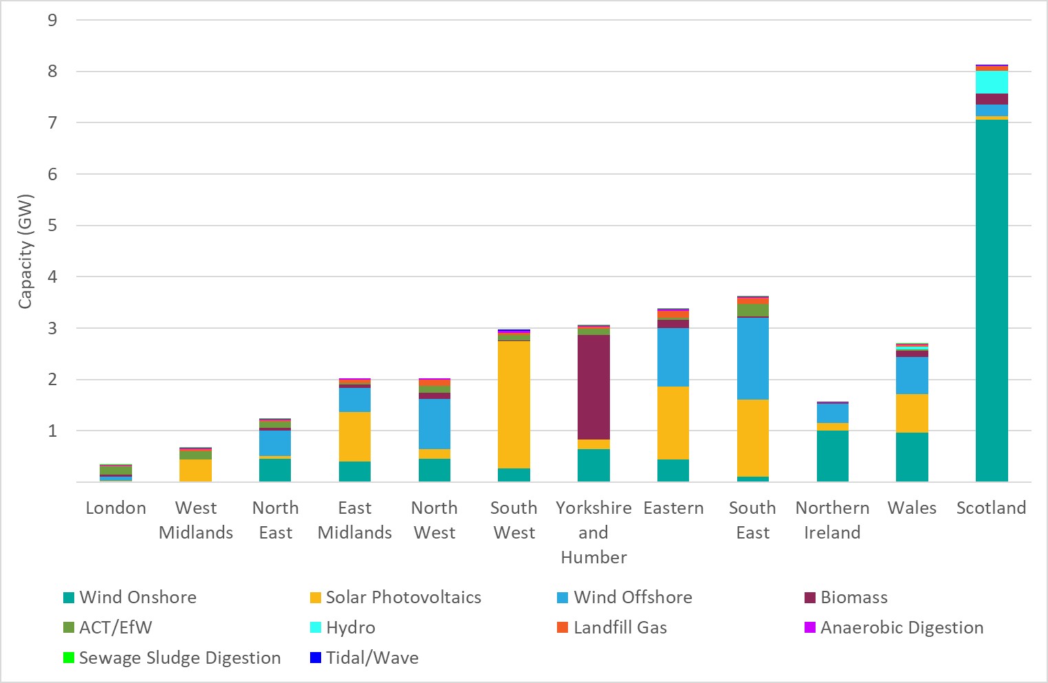 Nevertheless, the report shows how the low cost of these two technologies has led to them dominating the UK’s renewable energy generation capacity, with Scotland accounting for the great majority of onshore wind and the South West leading the way on solar PV.