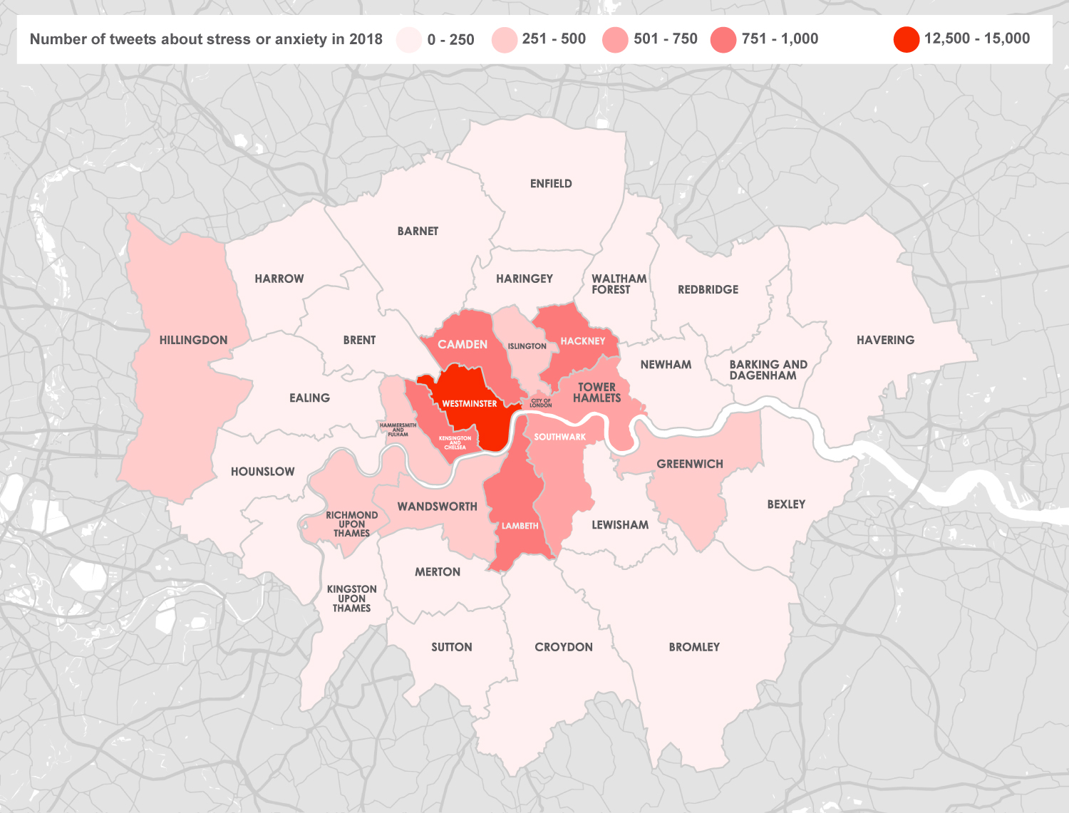 The heatmap above demonstrates that the most central areas of London are the ones that tend to have higher levels of stress, except for Hillingdon further out in West London, which lands at ninth on the list with 462 stress-related social media mentions.