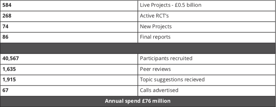 Hardly a week goes by without an HTA study appearing in a prestigious journal such as the Lancet or New England Journal of Medicine and outputs are incorporated into guidelines and policies such as those produced by the National Institute for Health and Care Excellence (NICE) and the National Screening Committee. Payback analyses on funds invested in research have consistently demonstrated evidence of knowledge generation, impact on policy and practice with gains for the wider economy. Because health outcomes tend to be better in research-active organisations, it was heartening to observe that in 2019, over 1 million participants were recruited into NIHR studies and 100% of NHS hospital trusts contributed to national studies. The NIHR has effected a culture change in the NHS so that research is now ’everyone’s business’.