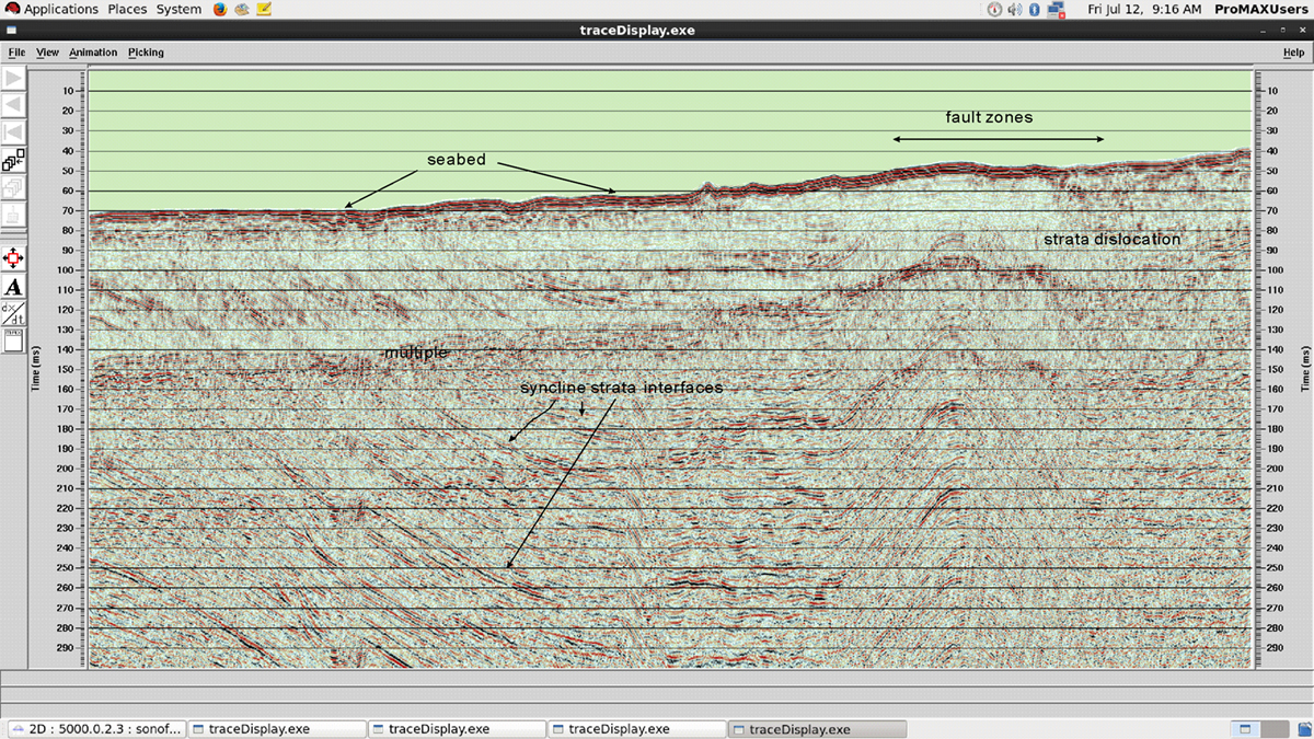 Reflection Seismic exploration is the main technique used to detect stratigraphic structure underneath the seafloor. This method aims to emit a certain range of frequency band of the shock wave in the water, so that the shock wave can penetrate into the seabed surface and transmit down during transmission. If a wave encounters a different density of media layer, there will be a portion of the sound wave energy reflected back to the surface of the water received by these hydrophones (or so-called streamer). Finally, we can digitise the received signals and process the data to make reflection seismic profiles.