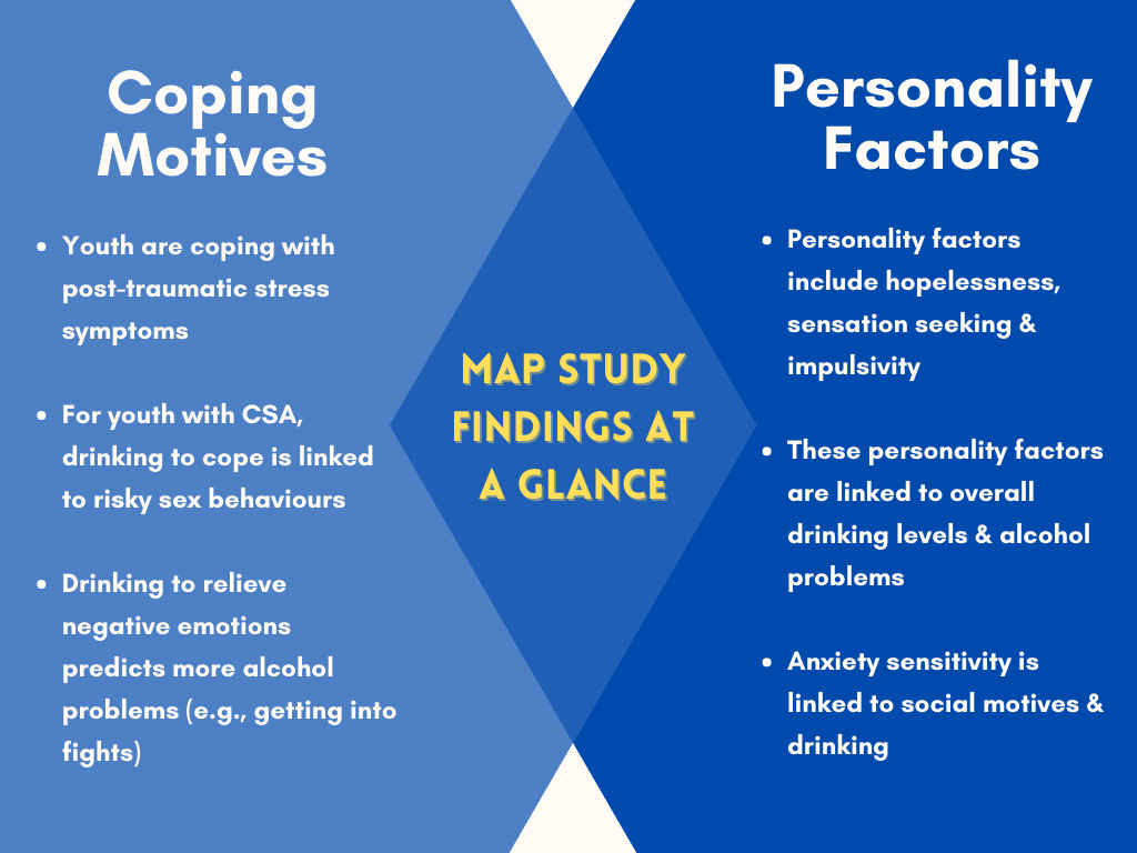 Adolescent personality vulnerabilities also play a role in maladaptive coping. Chronically feeling hopeless, tending towards seeking stimulation and impulsivity are all linked with overall alcohol use levels and alcohol problems (Hudson et al., 2015; Stewart et al., 2011). Feeling sensitive or fearful to signs of anxiety, interpreting them as threatening, is related to difficulties with stopping drinking once having started. Trait-like hopelessness and impulsivity are most closely linked with negative emotions and drinking to cope among MAP youth. For youth high on anxiety-sensitivity, motives for drinking are more likely to be related to the need to avoid social rejection. Brief, cognitive behaviour therapy that matches skill development to these specific personality vulnerabilities has an impressive set of research studies supporting decreased substance use, sustained over time. This Preventure intervention, created by Drs Patricia Conrod and Sherry Stewart, is currently being tested with child welfare-involved youth, in collaboration with Dr Hanie Edalati. Based on the Preventure model, the Well-Venture adaptation takes a trauma-informed approach (Edalati & Conrod, 2019). Currently underway in Montreal, Canada, pilot work shows that a third of youth had diagnoses for PTSD and used cannabis on a daily basis (Edalati et al., 2020).