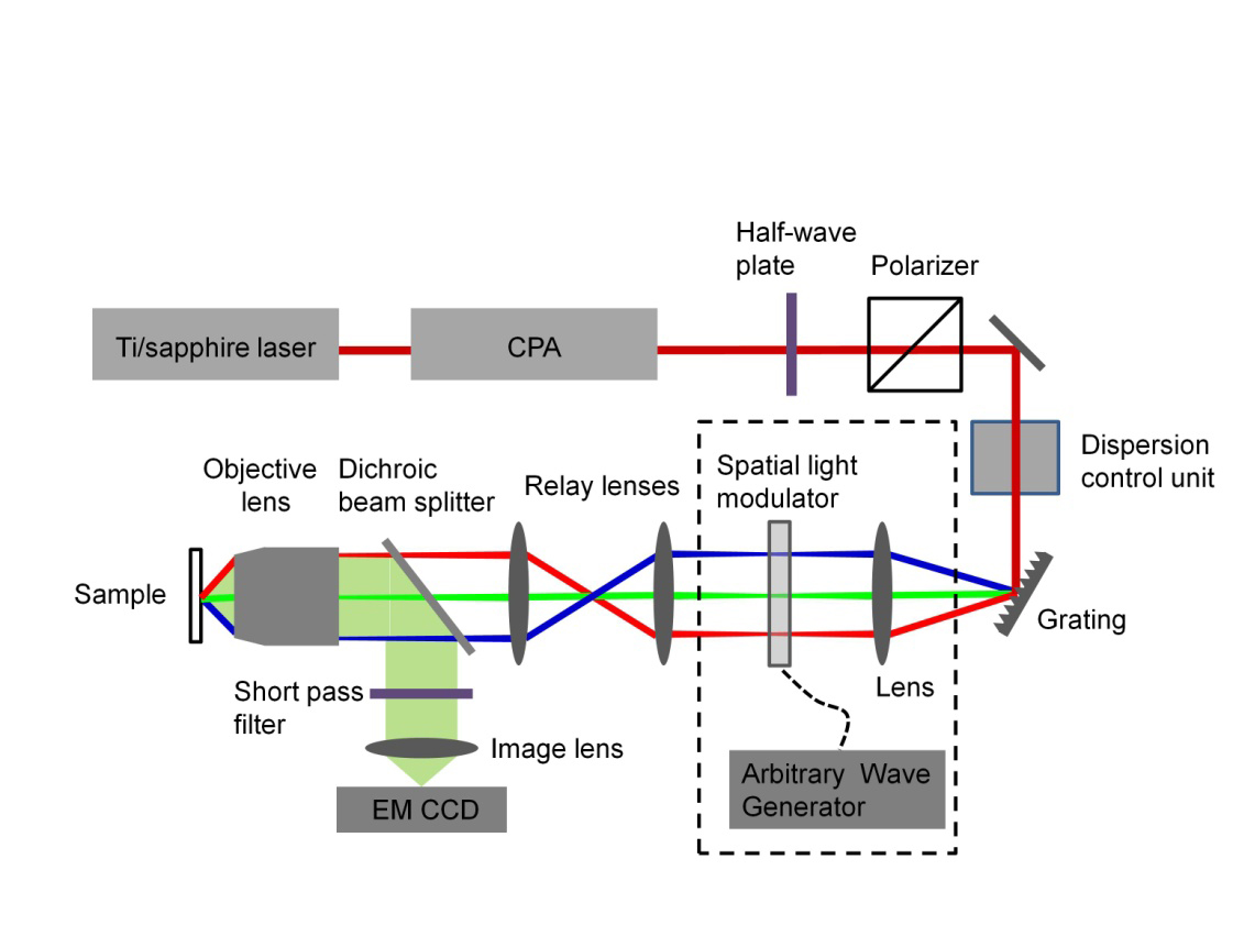 Figure 1 illustrates a schematic setup of the temporal focusing two-photon microscope. To achieve higher imaging speeds, a high peak power laser is needed. Therefore, a chirped-pulse amplifier (CPA) is added after the Ti:Sapphire laser to achieve high peak power (>1 uJ/pulse) at a repetition rate of more than 1 kHz. The incident angle of the grating is adjusted to ensure the central frequency follows the optical axis and propagates through the 4f setup, which comprises the collimating lens, relay lenses and the objective lens. Since the spectrum of femtosecond laser pulses has been spread out spatially by the grating, the next step is to add a pulse shaper (dash box in Figure 1) to use acoustic waves to control the dispersion of the femtosecond laser pulses in the spectral domain to achieve scan-less 3D volumetric imaging. The spatial light modulator (an acousto-opto modulator, AOM) is located at the 1f location to the left of the first collimating lens. The AOM is driven by a radio frequency arbitrary wave generator to create the desired radio frequency wave that controls the GVD of the femtosecond laser pulse.