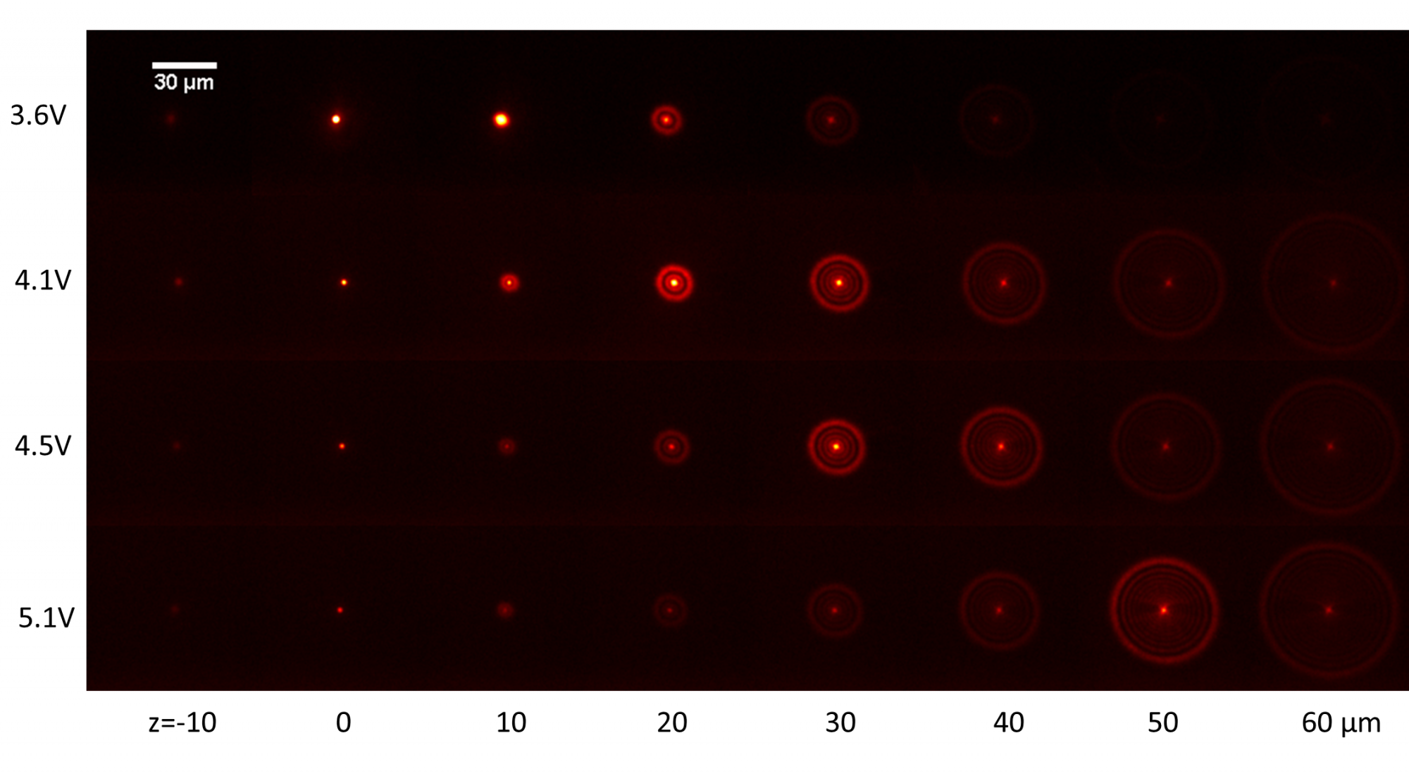 Our microscope demonstrated the capability of shifting the temporal focal plane via pulse shaping. We applied different voltages on the arbitrary function generator and the z position of the sample was scanned by moving the 3D sample stage with x and y positions fixed and finally, a fluorescence image was acquired at each z position. This varying voltage function induced GVD on the laser spectrum and changed the temporal focal plane, as shown in Figure 2. This shifting of the temporal focal plane by applied GVD depends on several parameters, such as laser spectral width and the numerical aperture of the objective lens. The temporal focal plane was shifted to z= 60 μm plane by applying a voltage of 10.2 V. This separation of the temporal focal plane from the geometric focal plane has a negative effect on the image quality. When the temporal focal plane is slightly shifted away from a geometric focal plane in the range of ±10 μm, the single fluorophore image becomes blurry. When this shift is larger, the single fluorophore image has the characteristics of concentric rings with peak intensity in the outermost ring and the central lobe becomes blurred as shown in the second to fourth row in Fig. 2.