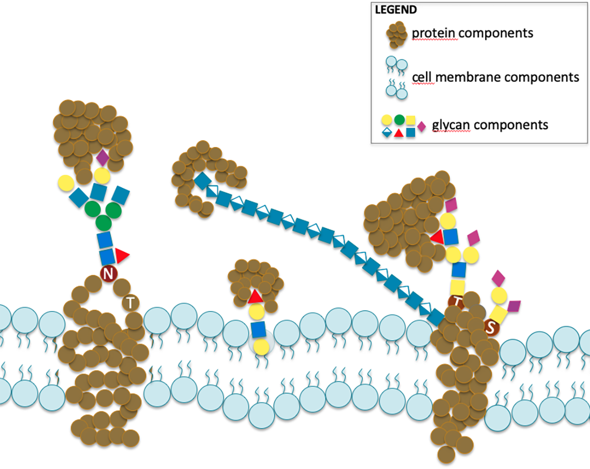 This particularly extended range of experimental approaches generate data with minimal overlap and in a diversity of often incompatible formats. Yet these data are meant to characterise the same phenomenon depicted in the image featuring cell membrane glycoconjugates (glycoproteins and glycolipids) with attached glycans bound by carbohydrate-binding proteins.