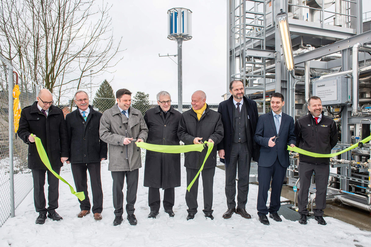Representatives of Swiss authorities and of the STORE&GO project are opening the Solothurn power-to-gas plant