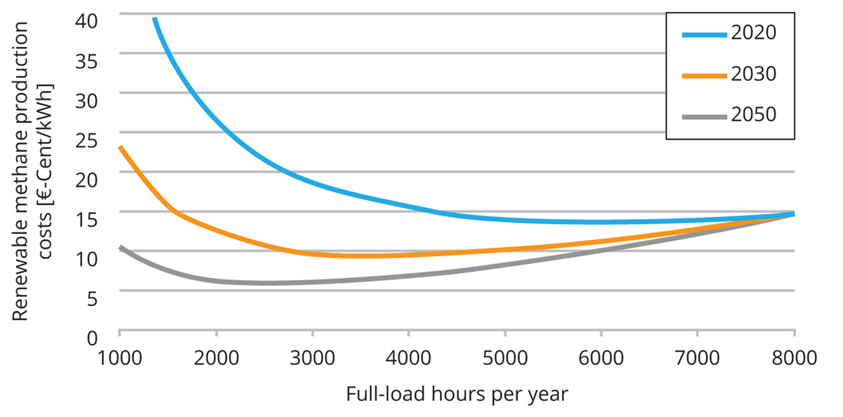 Production costs of renewable methane (lower heating value) from a PtG plant with 100 MW electrical input. The average production costs rise when running the plant also in times of high electricity prices