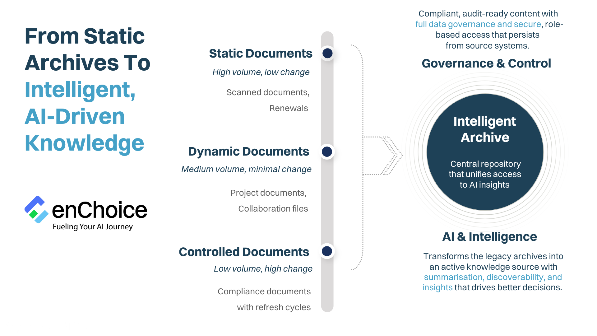 enChoice encore, the technology foundation for this model, connects to existing ECM and content systems without needing migration or reorganisation. It preserves original permissions and classifications while exposing information to AI in a structured, policy-aware manner.