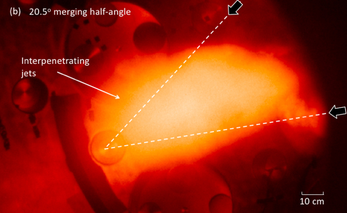 To explore the physical processes underway in the jet merging, we used the coaxial plasma guns designed and built by HyperJet Fusion Corporation (detailed in several of the preceding articles in this series) to fire supersonic plasma jets and collide them at an oblique angle. These experiments are conducted at reduced energy levels to those estimated to be required to produce breakeven fusion, but allow the physics to be studied at a greatly reduced cost. By varying the angle of the jet merging, we can study the effect of the jet relative velocity on the merging processes. Example fast-camera images of the plasma jet merging are shown in Figure 1.