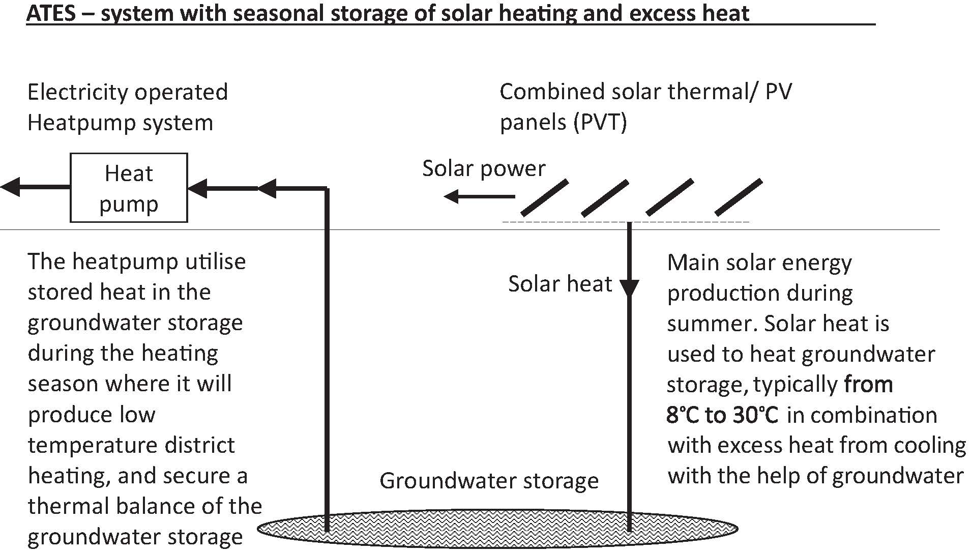 Recently, a very interesting combination of this new technology has been proposed together with ground water-based energy systems called ATES or Aquifer Thermal Energy Storage developed in Denmark by the Enopsol company. This can be utilised as a seasonal storage for the solar heating coming from the PVT elements, while heatpumps will have a high efficient operation in the heating season by help of the solar heated ground water storage.