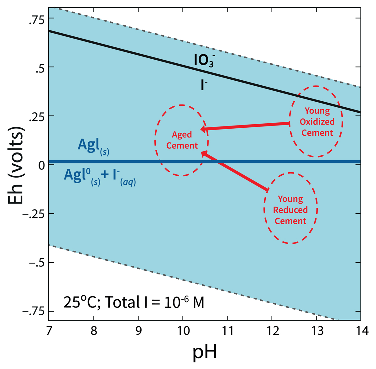 However, AgIZ encapsulated in slag-containing grout, the most common type of grout used for low-level radioactive waste disposal, was entirely ineffective at immobilizing iodine. While the slag-free grout with AgIZ released only 3.3 µg/L total iodine into the contact solution, the slag-containing grout released 19,269 µg/L total iodine. Based on thermodynamic calculations, the strongly reducing conditions of the slag-containing system (Eh was -392 mV) promoted the reductive dissolution of the AgI solid, forming a dissolved form of silver, Ag0(aq), and releasing iodide into the aqueous phase. The slag-free grout system was maintained under more oxidizing conditions (Eh was 439 mV) and a minimal amount of iodine was released from the grout.