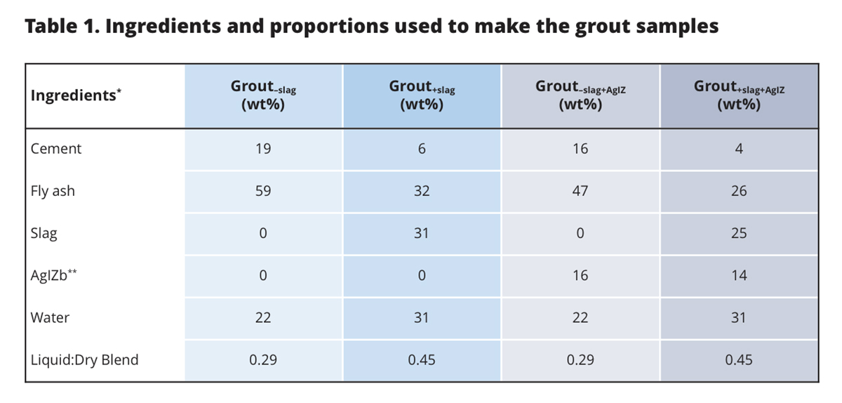 One of the ways 129I can be immobilized is through the formation of insoluble silver iodide solid, AgI, which is only possible in the presence of oxygen (Fig. 1). The silver technology is commonly deployed by coating silver on zeolites, AgZ, and then putting it contact with the aqueous or gaseous 129I waste stream. The objective of a recent study [Kaplan et al., 2019] was to quantify the effectiveness of two grout waste formulations for disposing of the used AgIZ (Table 1). The grout formulations were with and without slag, an ingredient used to reduce porosity and to create a strong chemically reducing environment to immobilize redox reactive contaminants).