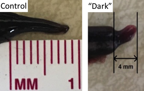 Surprisingly, we recently performed an experiment in which 12 adult fish had their tails amputated, but none of the fish regenerated a blastema as expected even two weeks after amputation. These fish had been kept in a room adjacent to the main aquaria room. Upon return to their original tanks in the main aquaria, these fish began regenerating their tails. This observation led us to hypothesize that decreases in light exposure negatively affected tail regeneration in S. macrurus. S. macrurus fish (n=5) were then placed in either constant darkness conditions or on a control 12hr-on/12hr-off light cycle condition (Figure 1) and regeneration blastema length measured seven and 14 days post-amputation.