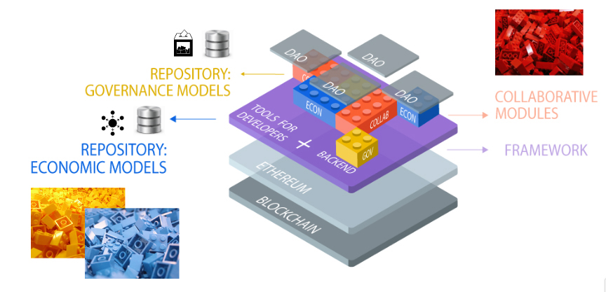 If that vision is to be realised, at least partially, the building of DAOs is critical. Thus, the project will build both a framework and tools to enable the modular construction of DAOs, especially those providing collaborative economy features. Therefore, the project will build “lego’s” or building blocks, embedding different features, so that developers may combine them to deploy their new platform. By being a fully free/open source platform, anyone could build their own building blocks for their specific needs and if desired, contribute them for others to use.