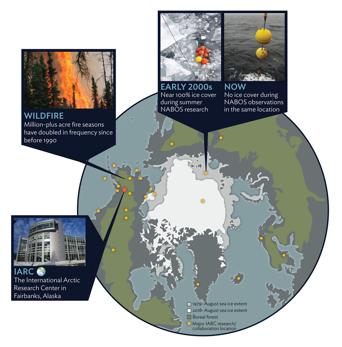 Across all facets and functions at IARC and the global North, there is increasing recognition that solutions to Arctic problems require multi-sector, multi-stakeholder/actor approaches. IARC helps chart pathways, by building collaborative networks across the Arctic and non-Arctic nations, and by supporting efforts, such as the Arctic Observing Summit. Disruption from climate change in the North challenges our current institutional systems and governments. Observations of Arctic change both calls for and support key decisions in this decade to forestall future problems.