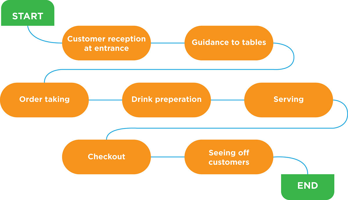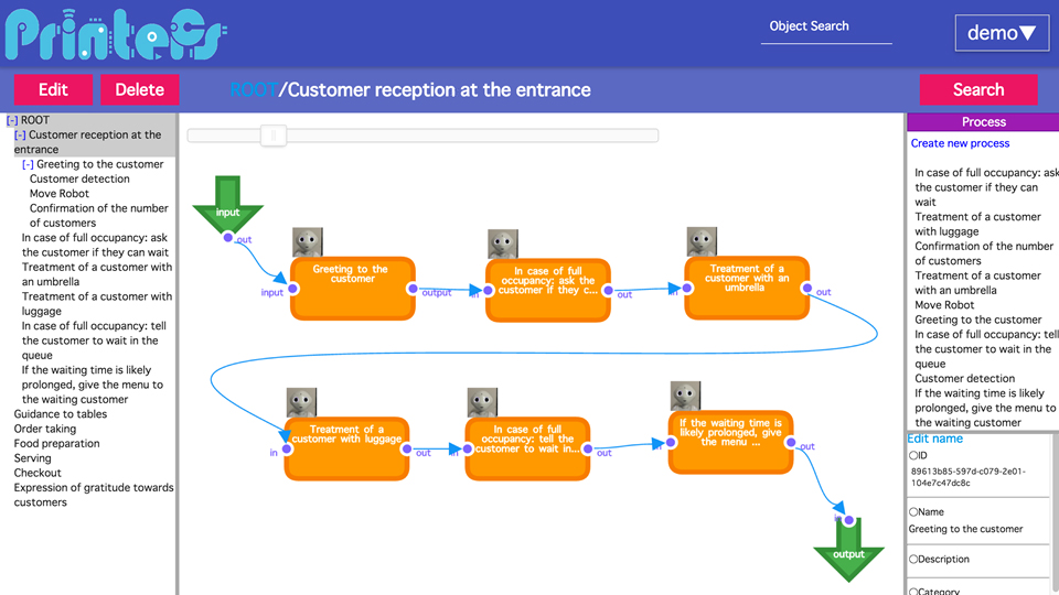 According to the service workflow, Pepper and Sota recognise the customers at the café entrance and greet them. As PRINTEPS is equipped with sophisticated imaging sensors with real-time feedback, it can differentiate between people entering the cafe, leaving it or just passing the doorway. Also, the image sensors will calculate the number of people in a group, as well as their approximate age and gender. This information gives Pepper the ability to deduce the type of group, for instance, a family or a group of professionals. It might be necessary for Pepper to act differently according to the type of customer.