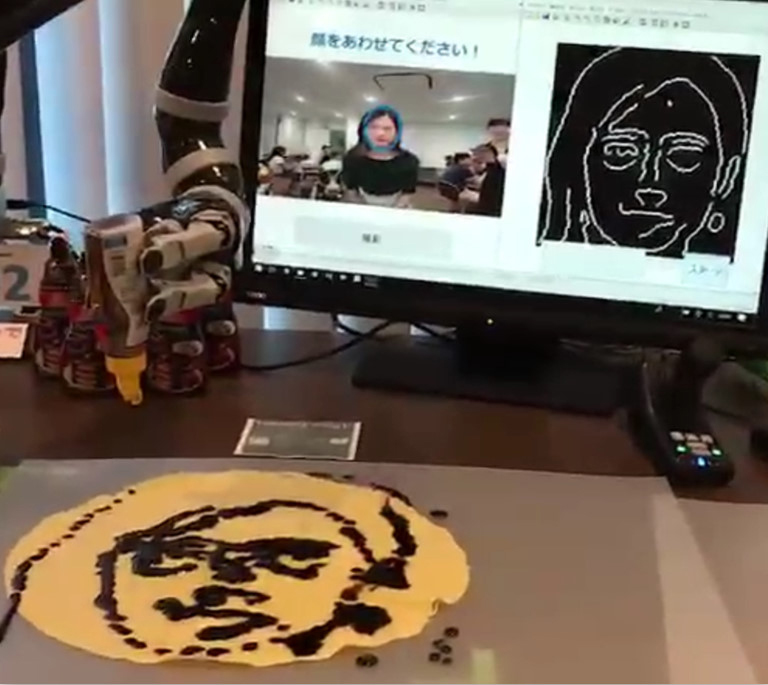 Each table had an omnidirectional camera to detect people using the table to check if the table was unoccupied. The orders include soft drinks and how to decorate on crepe dough. After CrepeRobot Q makes crepe dough, JACO2 prepares the ordered soft drinks and makes the decoration on the crepe dough. When the customer orders their portrait for the decoration, a camera on the PC takes her/his face picture and the image recognition application on a PC extracts its outline and transfers the data to JACO2. JACO2 makes a portrait based on the outline data, squeezing the chocolate tube, as shown in Figure 4. While it almost takes three minutes or more to create a portrait, Furhat explains how each robot works in the robot cafe.