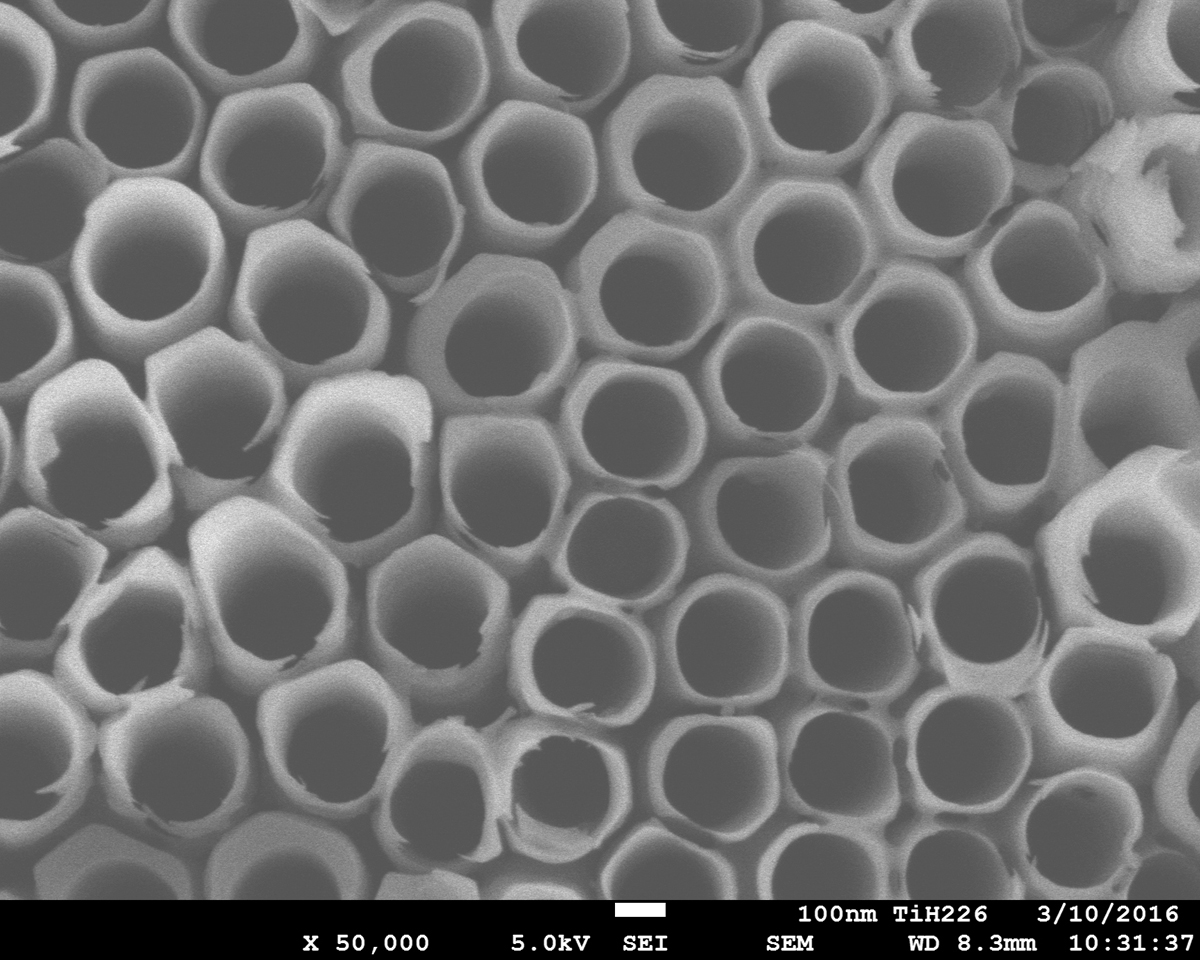 Figure 1: A scanning electron micrograph showing the top view of the TiO2 nanotube layer. One can see hollow nanotubes that are closely packed to one another.