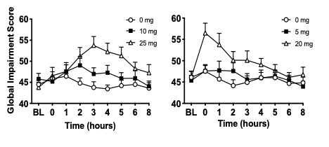 In our data, DRUID® scores show the highest level of impairment within 30-45 minutes of beginning cannabis inhalation, and then a decrease over a period of 2-3 hours, as would be expected as the body processes the psychoactive components. The screenshot of the DRUID® graph shows how a person’s impairment begins at their baseline, increases following consuming cannabis, reaches a peak and then declines.