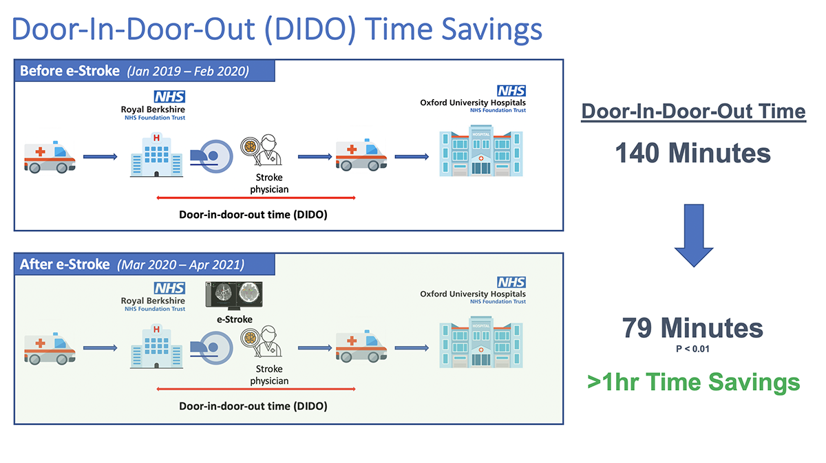 The study results were presented by Dr Kiruba Nagaratnam, Clinical Lead for Stroke Medicine at the Royal Berkshire Hospital, where e-Stroke was first implemented in March 2020 to facilitate faster diagnosis and decision making. As part of the Thames Valley stroke network, the hospital in Reading routinely provides stroke care such as thrombolysis to the more than 700 stroke patients it admits each year, achieving rates in excess of 25%. It also transfers patients with large vessel occlusion to Oxford and Charing Cross hospitals for mechanical throm-bectomy.