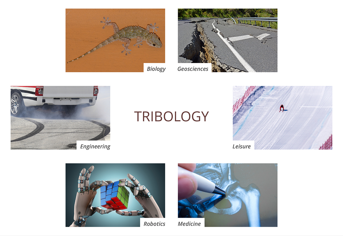 The breadth of the applicative fields of tribology (figure) is even wider than those four fundamental underlying disciplines. For instance, acousticians will be invaluable to understand and reduce the large variety of noises that are induced by friction, like the squealing of a door or the rolling noise of tyres; geologists are necessary to uncover the mechanisms underlying earthquakes and improve mitigation of the associated risks; biologists, neuroscientists and roboticists are required to better understand the sense of touch and create robots with either human-like tactile skills or gecko-toe-like adhesive capabilities.
