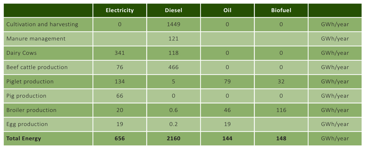 Swedish agriculture uses around 10 TWh of energy, of which 3.11 TWh in the form of diesel, electricity and biofuels, as displayed in the table above. This direct energy use will generate approximately 3.64 TWh of indirect energy needed to produce fertilizer and other means of production, of which fertilizer use is about 2.31 TWh. Production in greenhouses and drying costs for cereals consume somewhere between 3-4 TWh, altogether a grand total of about 10 TWh/year.