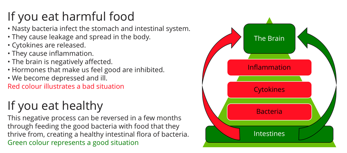 The science tells us that we have abused our contract with the bacteria and made them our enemies. If we eat the wrong food, they eat on our internal organs, create leakage and send out toxic substances in our bodies. We get serious illnesses like severe depression, diabetes, attention deficit hyperactivity disorder (ADHD), osteoarthritis and many other diseases.