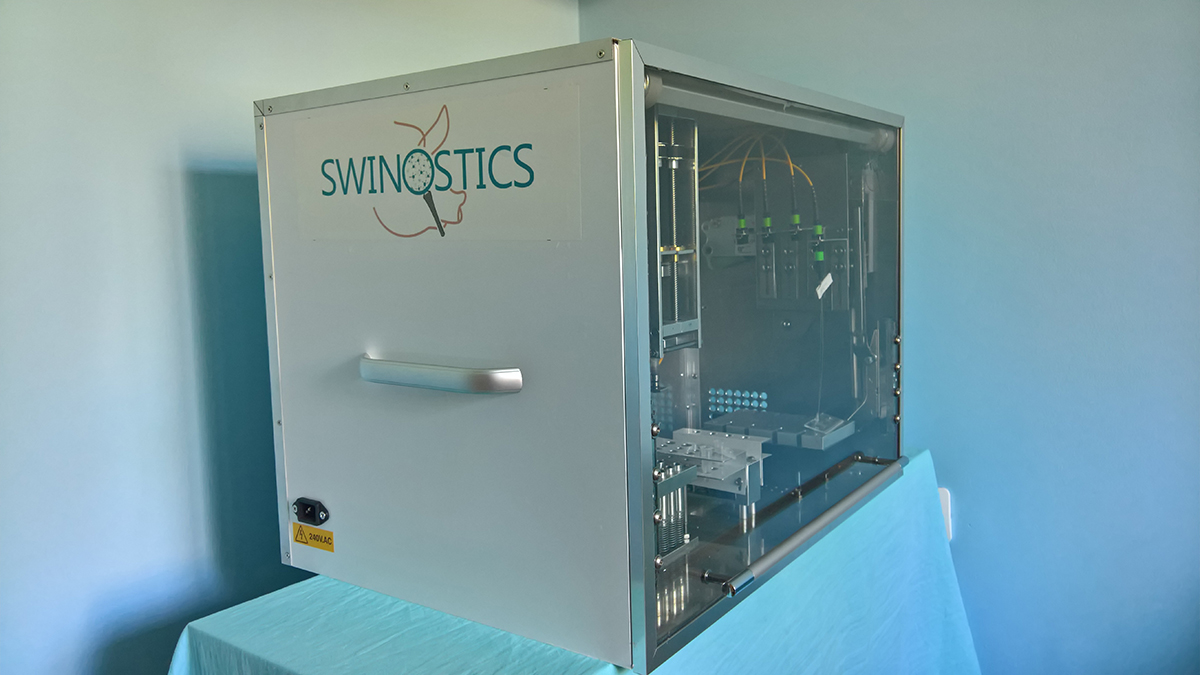 The project addresses the aforementioned need for reliable and fast, on-site diagnostics for pig farms, by developing a novel field-use device, based on advanced, proven, bio-sensing and photonics technologies. Even though the approach is applicable to a variety of infectious agents, SWINOSTICS is focused on emerging and endemic viruses (African Swine Fever virus, Porcine Reproductive and Respiratory Syndrome virus, Porcine parvovirus, Porcine circovirus type 2, Classical Swine Fever virus, Swine influenza virus) causing epidemics in swine farms in Europe that lead to relevant economic damages. The diagnostic device allows immediate threat assessment at the farm level with an analytical quality comparable to that of commercial and institutional laboratories. The device is easily transportable and provides results in less than 45 minutes for four oral fluid (or other types of) samples simultaneously, making it highly suitable for use in the field. The modular construction of the device allows future upgrades to increase capacity if so desired.