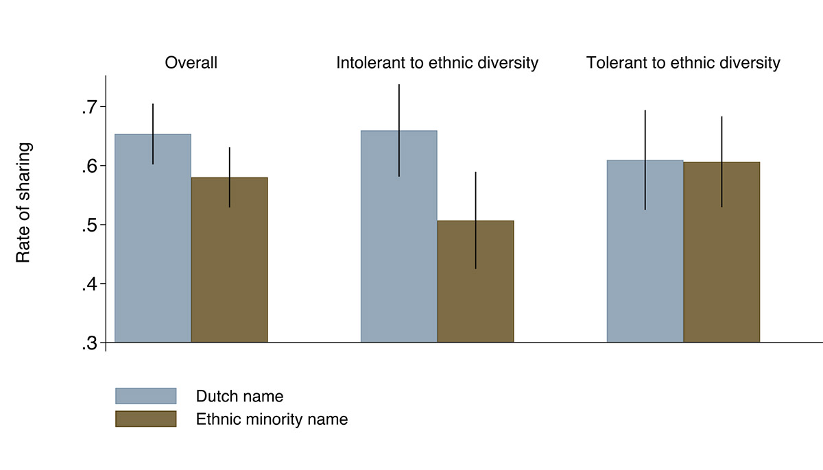 “In the study you are referring to, which was conducted with my colleague Elena Cettolin, there was some real money at stake for participants. Native Dutch trustees were faced with a real but anonymous partner and were shown the first name of this person. Half of the trustees had a partner with a native Dutch name and the other half had a partner with an obvious minority name. Trustees were carefully explained that their partner had made a risky choice to invest money in them, they had trusted them, and that by investing the money, the total pie of money increased. Trustees could then either take most of the pie and leave a bit for the partner or share the pie with the partner. We found that trustees were less likely to share with partners with a minority background than with a majority partner.