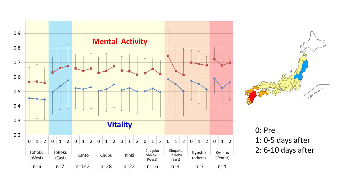 The graph also shows depressive tendencies that were measured using audio for five days before the earthquake, five days during which the aftershocks continued, and five days after the aftershocks began to subside. Since the only data from individuals who made at least one call in each period were extracted, the sample size was small; however, the characteristics of each region were still present. It can also be seen in the graph that the red area (earthquake-affected region) around the epicentre of the earthquake fell sharply during the period in which the earthquake continued to fall sharply during the aftershocks, then in this area, peoples anxiety recovered somewhat later on. This graphical depiction shows that depression gradually increased in the region around the disaster area. Although no major changes were seen in other regions before and after the earthquake, the areas damaged by the Great East Japan Earthquake that occurred five years ago experienced changes that were different than other unaffected areas. These figures may have captured psychological changes, such as PTSD; however, it should be noted that this would be a mere deduction because no other tests have been conducted to confirm this.