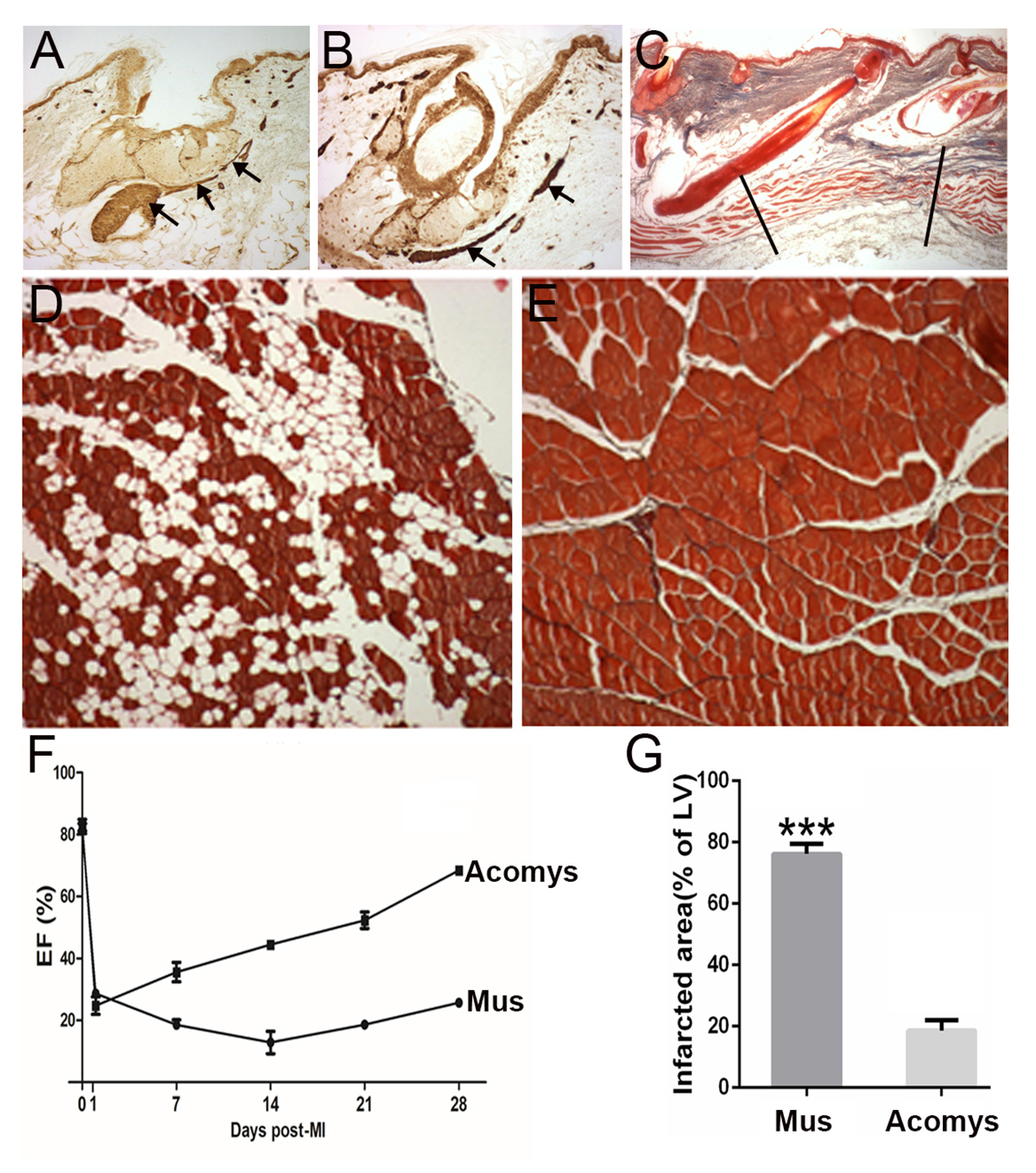 Remarkably, the spiny mouse heart after a myocardial infarction rapidly recovers its pumping performance in terms of the ejection fraction (Fig 1F) and there is a vastly reduced scar present at the site of damage (Fig 1G). It effectively regenerates its cardiomyocytes after a heart attack and discovering the molecular basis of this would have a huge impact on human health as this is the biggest killer in the Western world.